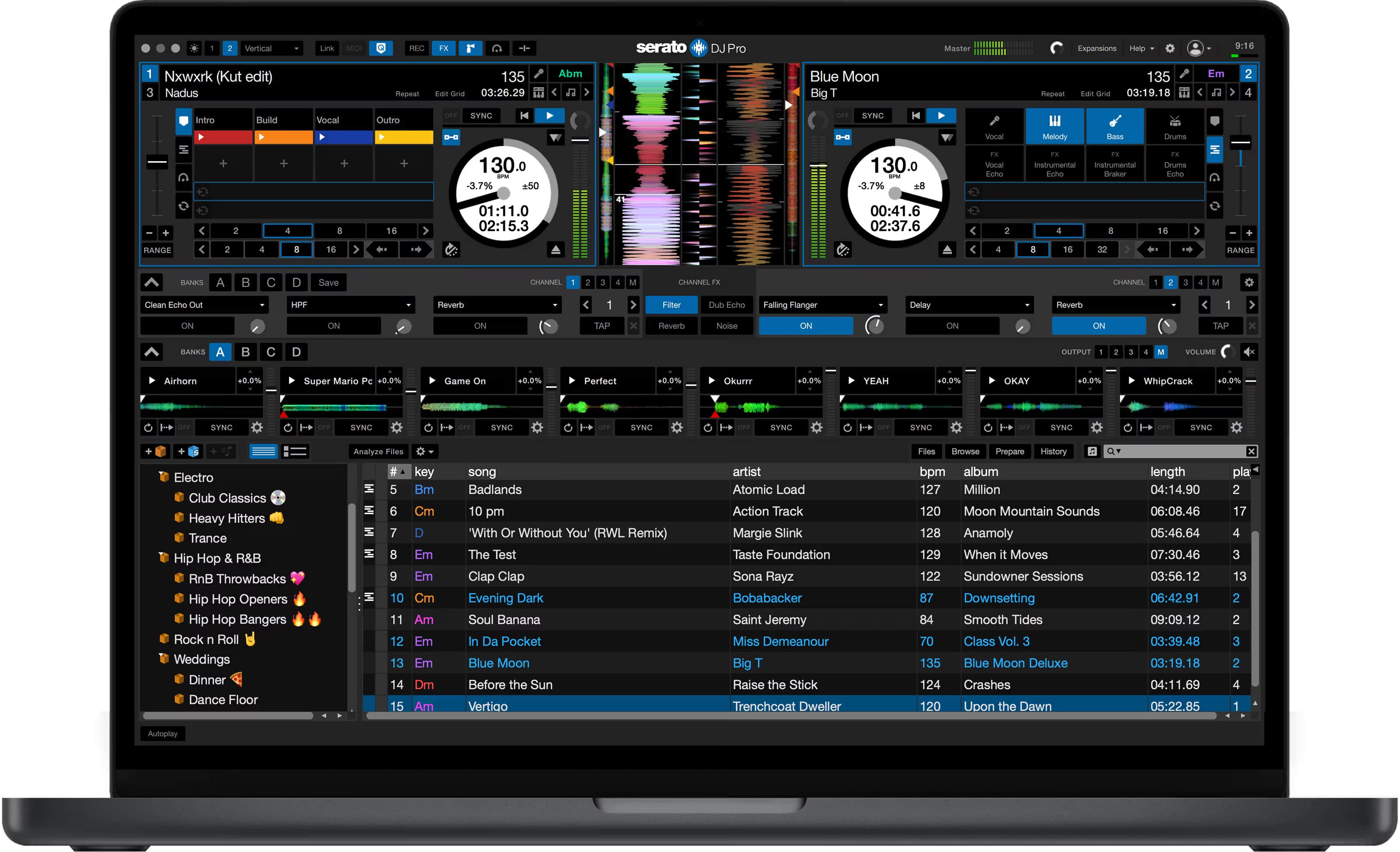 功能方面,Serato DJ Pro 提供了全面的 DJ 工作流程支持,包括双甲板或多甲板混音、热点(Hot Cue)、循环(Loop)、采样器(Sampler)、音效(FX)、即兴重混(Remix)等多项核心功能。用户可以轻松加载曲库,快速搜索并管理音乐文件,还可以通过色彩波形、节拍网格和关键字检测等可视化工具,更直观地掌握曲目的节奏和结构。