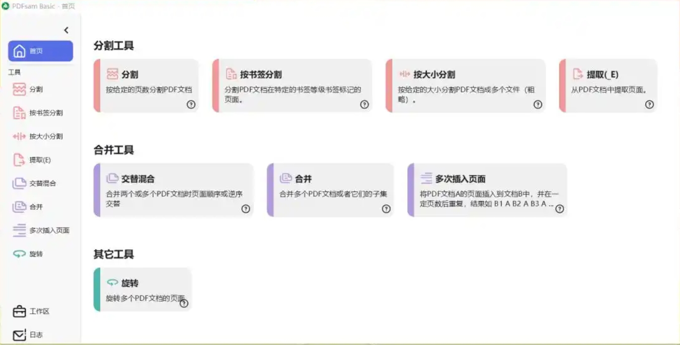 PDFsam是一款功能多样的PDF处理工具。PDFsam支持PDF分割、合并、旋转、交替混合、提取、按书签分割等功能,满足用户不同的PDF文档处理需求。